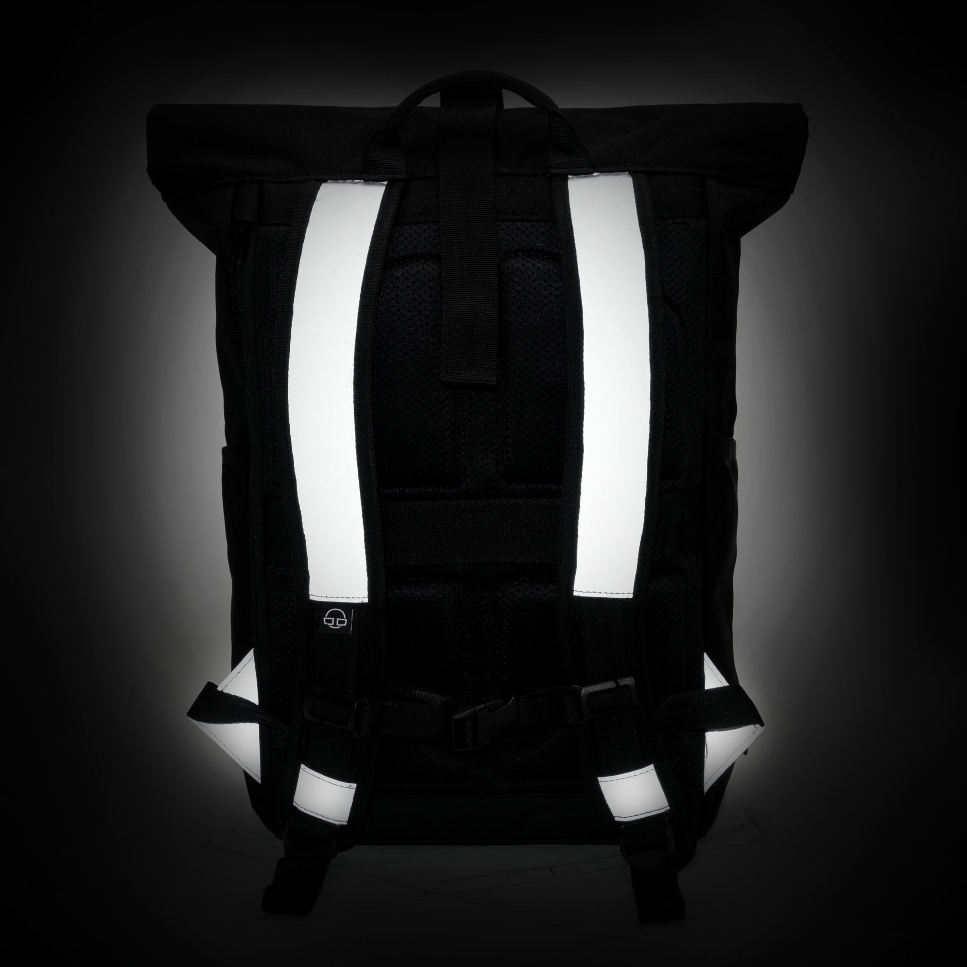 The outer fabric of our "Allen" backpack is made of recycled polyester, reinforced on the back with a TPE coating. The inner lining is made of 100% recycled fibers. The environmentally friendly, PFC-free impregnation makes the roll-top water-repellent.